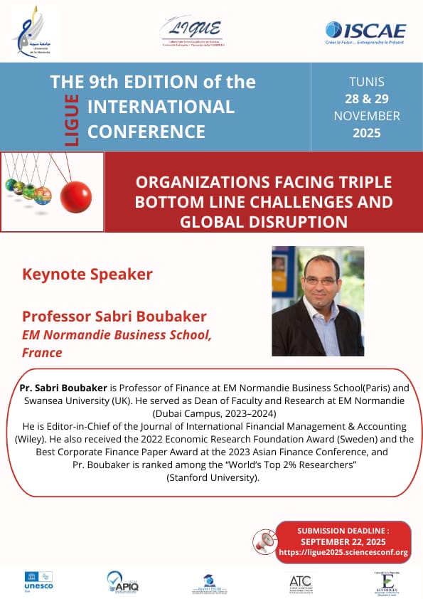 The Laboratoire Interdisciplinaire de Gestion Université Entreprise-LIGUE team is delighted to anounce its collaboration in the symposium of the Global Research Institute of Paris: ‘Societal engagement of organizations and sustainability in Africa’, taking place in Tunis, El Mouradi Hotel, Gammarth, Tunisia on 27 November 2024