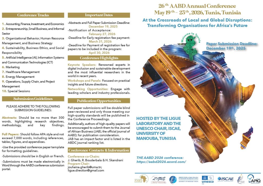 LIGUE and the UNESCO Chair on Higher Education for Sustainable Development in Africa are hosting this conference in partnership with the Journal of African Business (Indexed / Impact Factor 2024: 1.8; 5-year IF: 2.5; CiteScore 2024: 5.7; CiteScore Best Quartile: Q1; SNIP 2024: 1.184; SJR 2024: 0.556).